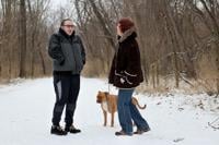 Amber Yohnka, right, walks her dog, Hooch, with ex-boyfriend Wade Woolf on Wednesday at Capen Park. The two broke off their romantic relationship four days before Valentine’s Day last year but remain close friends. “I try not to think about it,” Yohnka said when asked where she wants the relationship to go in the future. “I was glad for the space, but I still tell him I feel intoxicated looking into his eyes.”