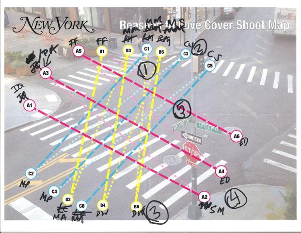 Cass more often shoots these portraits with random people, and this time we had to make sure everyone was recognizable. The solution there was to map out a standardized set of paths, a crosshatch graphic of lanes to walk, three across the intersection in three directions — nine short runways forming a megahashtag. (See graphic below, by photo editor Megan Paetzhold.) A few days ahead, they test-drove the plan with stand-ins and timed it all.
