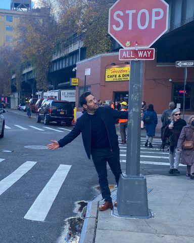 Early on the big day, November 28, beginning a bit before 7 a.m., the subjects began to arrive, each checking in at Hector’s. A dozen staff members, wearing orange safety vests and yellow baseball caps for visibility, stood just outside the frame of Cass’s viewfinder at the ends of those nine lanes. (They were there partly to direct the pedestrian traffic and partly to help participants avoid the actual traffic, since the intersection wasn’t closed to cars.) Each staffer held up a colored placard, effectively a target to guide the photo subjects as each sauntered through on command. Spike Lee walked first, then dashed off to the airport. Paul Rudd was his delightful Paul Rudd self, mock-hailing a cab in the crosswalk. Ziwe charmed everyone she met. Chuck Schumer shook hands with everyone, including some truckers who stopped in the middle of the intersection to shout “hello” to him. (Then he headed back to Washington and, a few hours later, voted on the marriage-equality bill.) Emily Ratajkowski brought her huge dog. Liev Schreiber brought his tiny one. The outrageously dressed costume designer Machine Dazzle released a flurry of orange balloons around his feet as his walk commenced, then headed to Hector’s afterward for breakfast. Dionisios, the manager of Hector’s, did a walk of his own. Tariq, a.k.a Corn Kid, bounced around the street, trying to keep warm, as photo editor Isabela Quintero kept him out of traffic. As the shadows began to lengthen, Keith McNally came over from Pastis to walk last, and that was a wrap.
